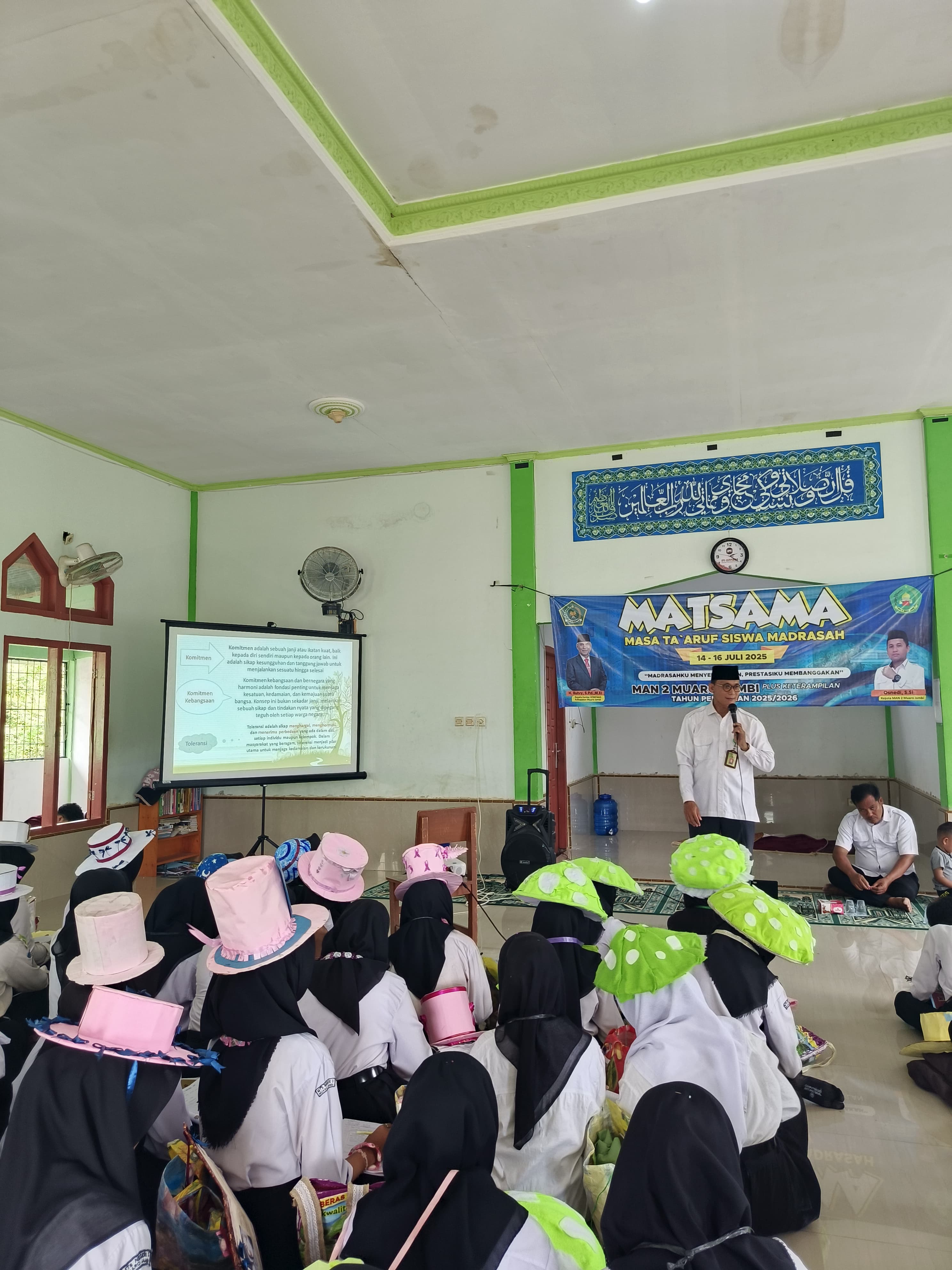 Muaro Jambi - MAN 2 Muaro Jambi 15 Juli 2025 bertempat di mushallah MAN 2 Muaro Jambi, massa ta'aruf siswa madrasah hari ke 2 mendapatkan salah satu materi tentang moderasi beragama yang di sampaikan langsung oleh Dok.M. Sidik. S.Ag. M.Pd. kepada 105 siswa siswi baru yang menjadi peserta matsama